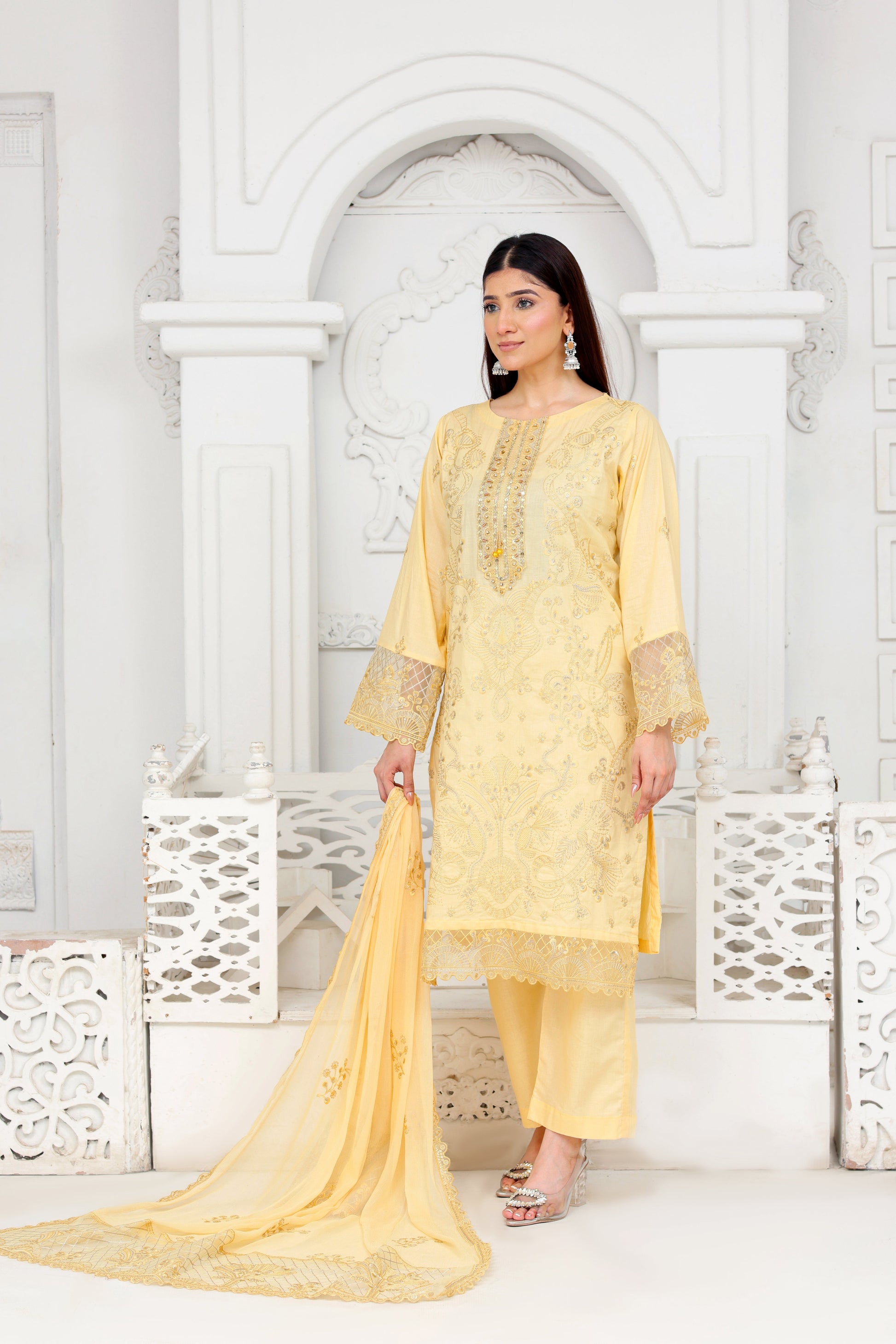 Elegant 3-piece stitched suit in light yellow, crafted from premium lawn. Features intricate thread embroidery, mirror work, and a handmade neckline. Comes with a heavily embroidered shirt, regular-fit trousers, and a Bamber dupatta with 2-side pallu. Perfect for festive, casual, and semi-formal wear